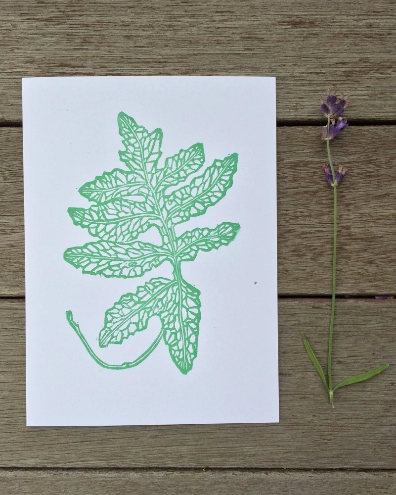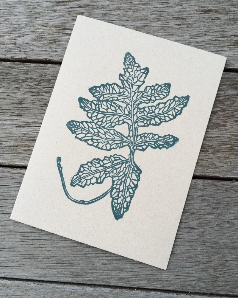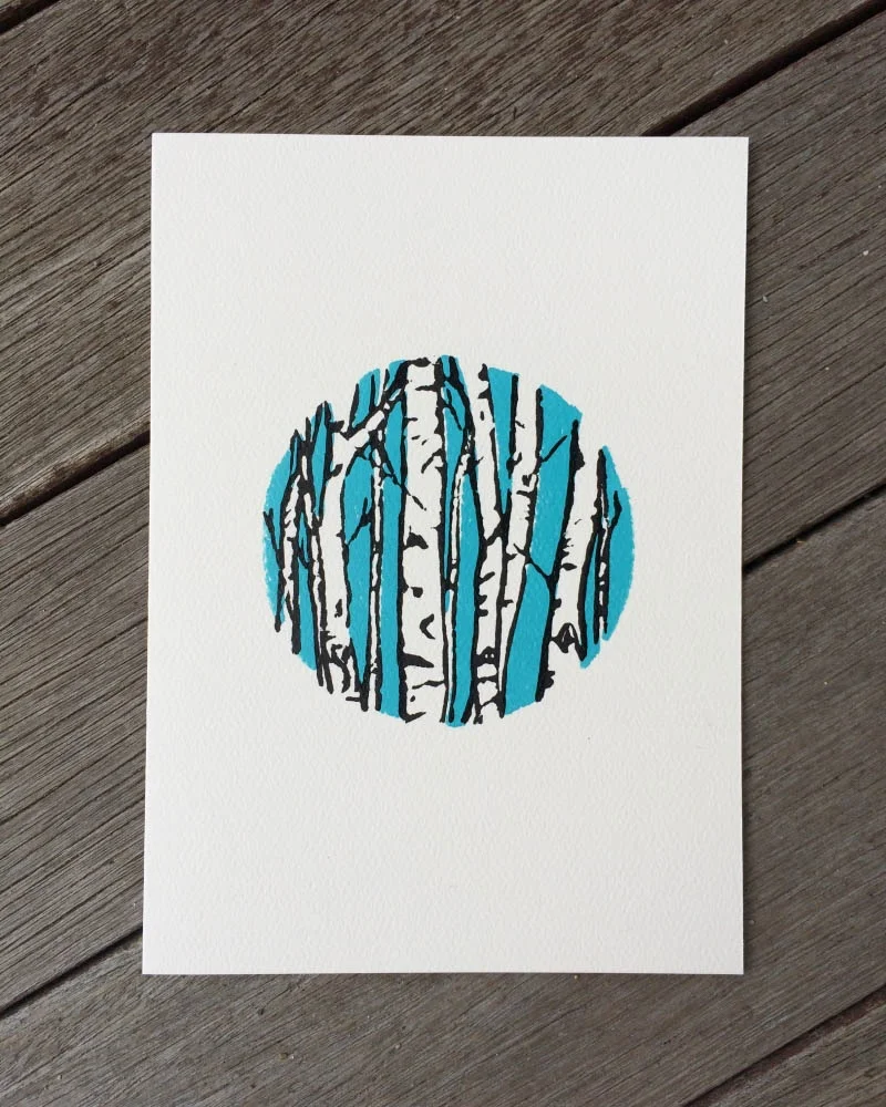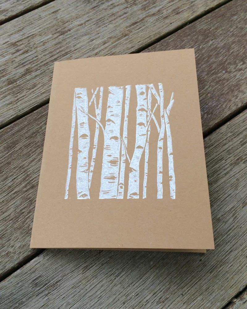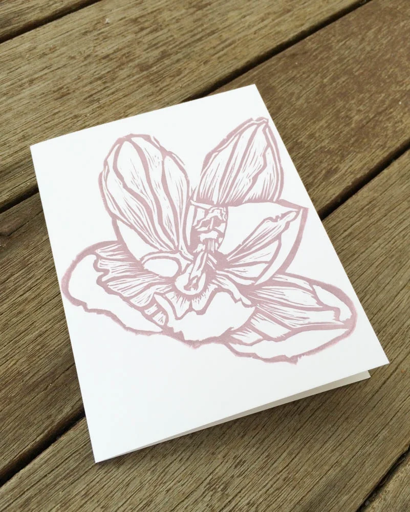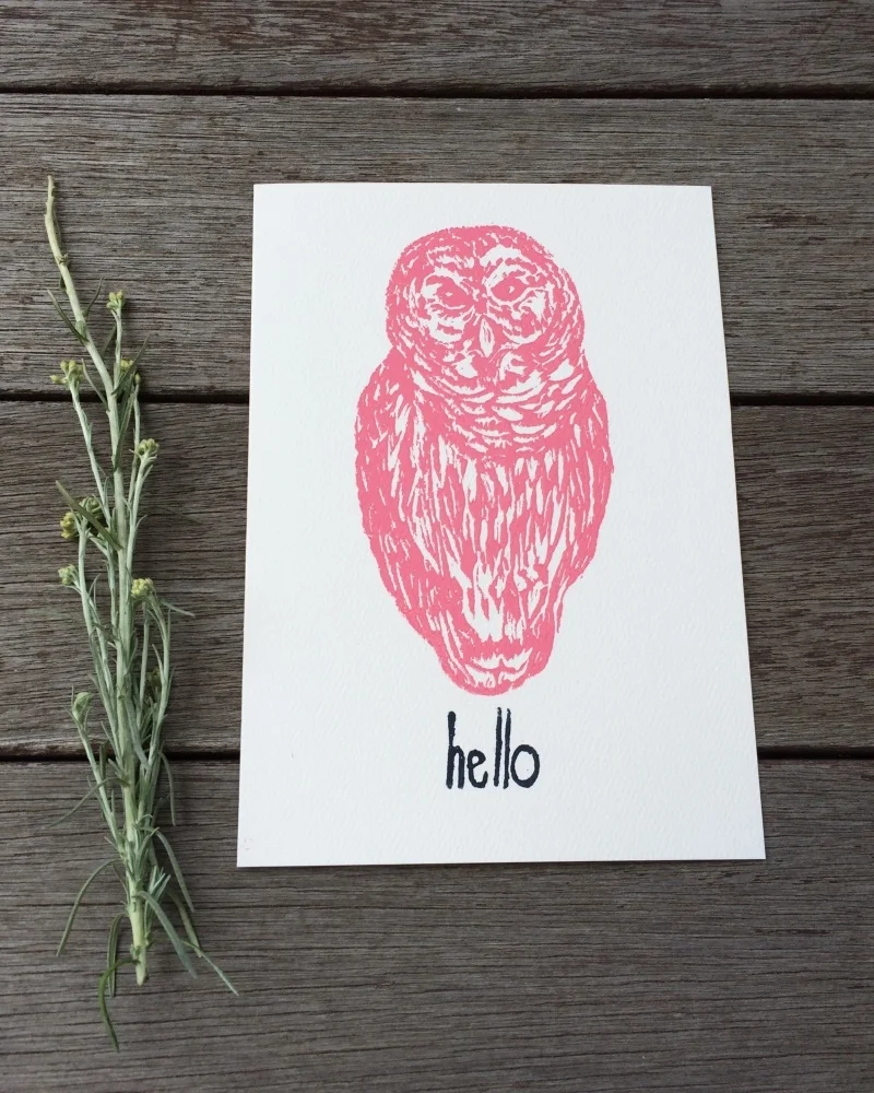 Drawn, hand carved into linoleum, and hand printed in our home studio using eco friendly inks. Each card is blank inside, awaiting your personalized message.